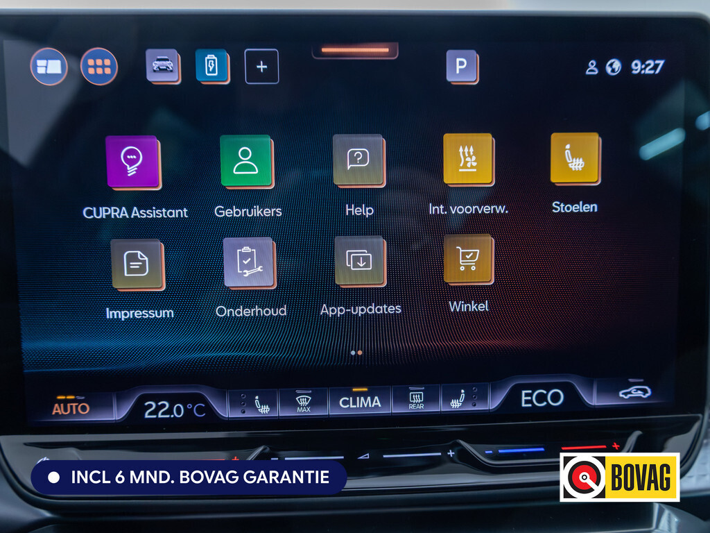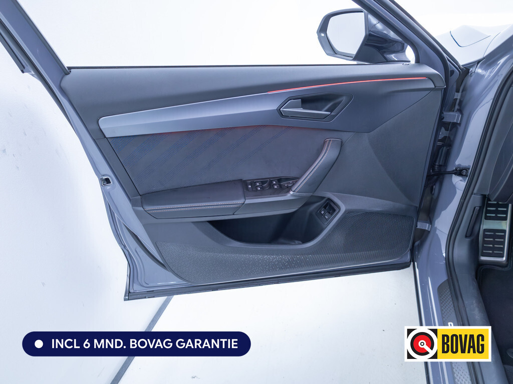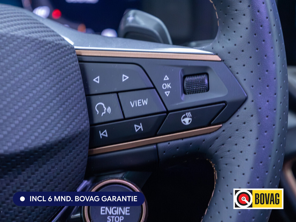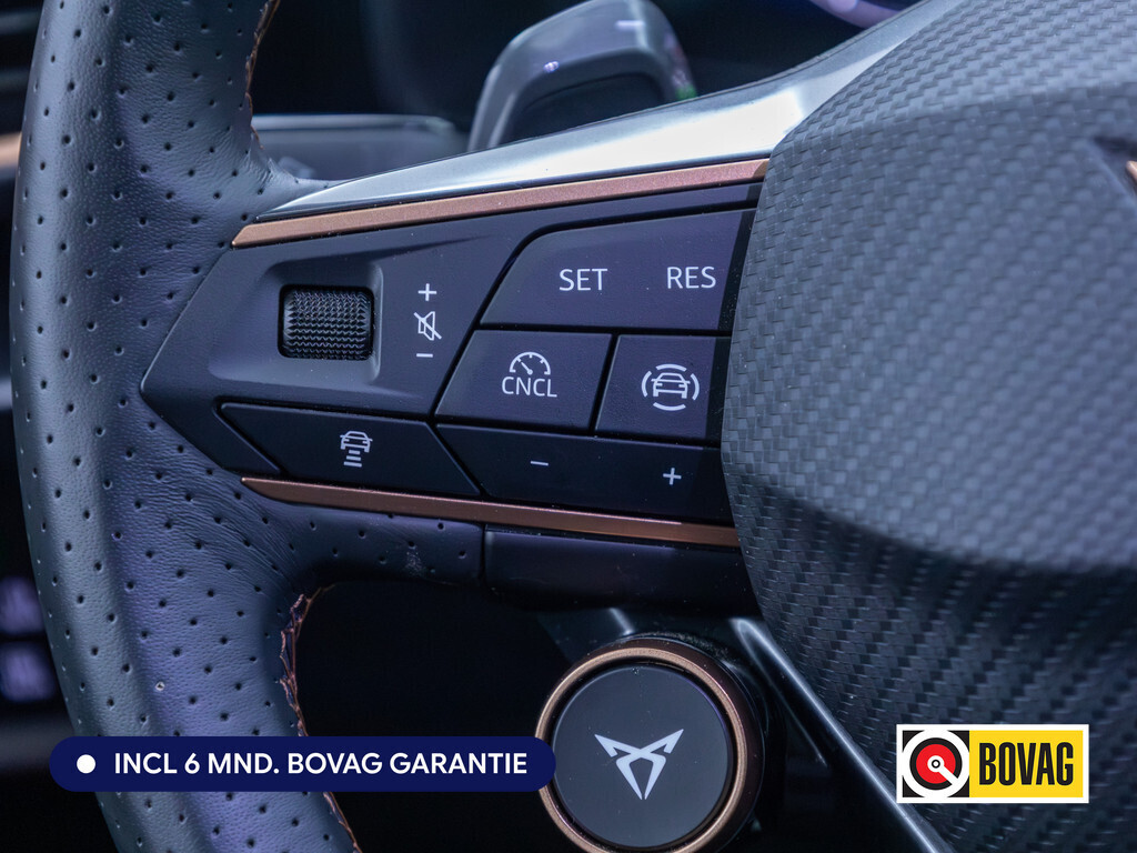 Deze CUPRA is voorzien van verschillende intelligente veiligheidsvoorzieningen. Ze kijken tijdens het rijden als het ware met u mee, ze signaleren potentieel gevaarlijke situaties en in een aantal gevallen kunnen ze ook ingrijpen. Een belangrijke bijdrage aan de veiligheid onderweg levert de verkeersbord-detectie in deze CUPRA. Ongemerkt buiten de rijstrook raken? Nee hoor, het Lane-keeping systeem waarschuwt en corrigeert. Botsingen met een voorligger gebeuren relatief vaak. De forward collision warning slaat tijdig alarm als dat risico ontstaat, zodat u kunt ingrijpen. Ook helpen het dodehoekdetectie, hill hold functie, vermoeidheidsherkenning en bandenspanningcontrolesysteem, uw rit tot een veilige rit te maken.