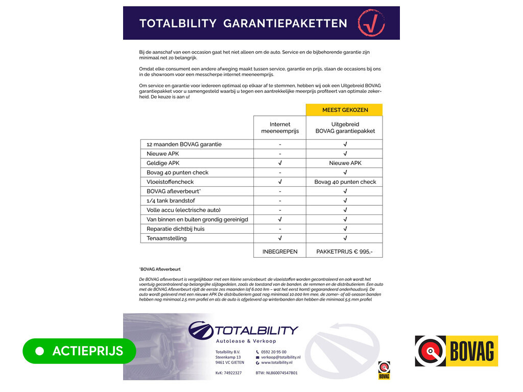 Voor extra gemoedsrust is 12 maanden BOVAG garantie beschikbaar voor een toeslag van € 595,-.