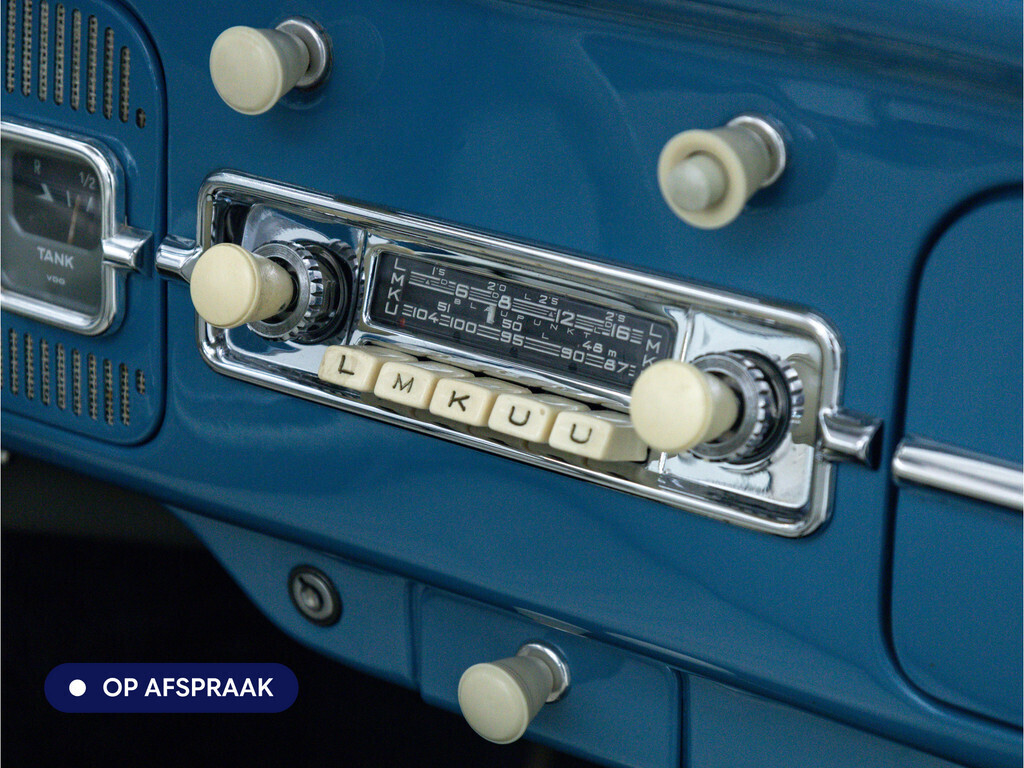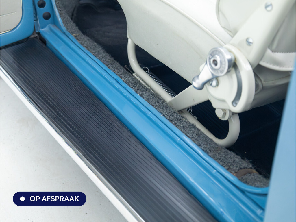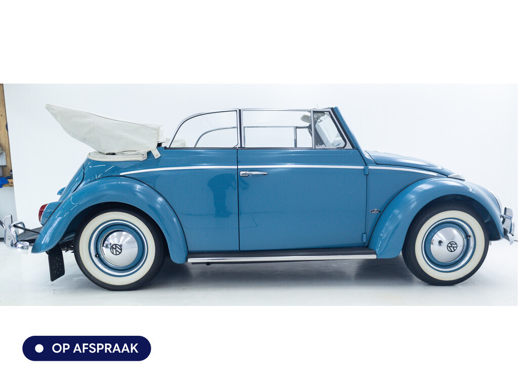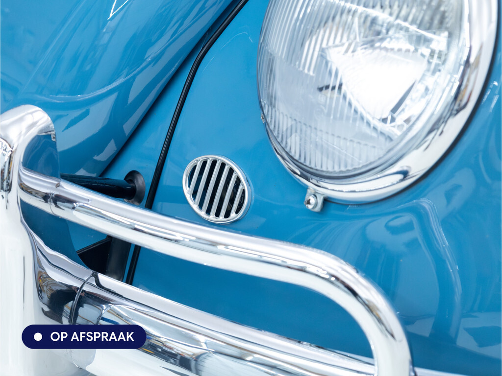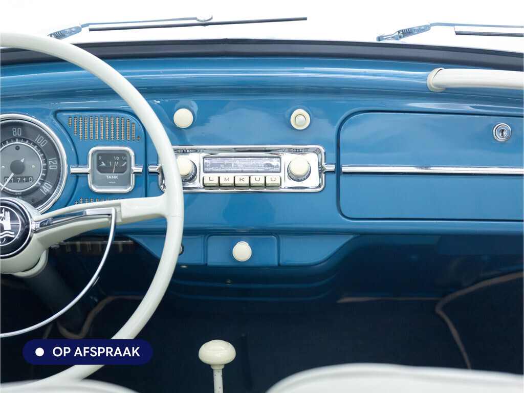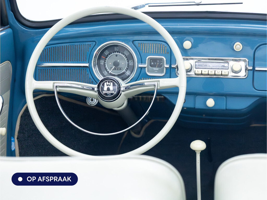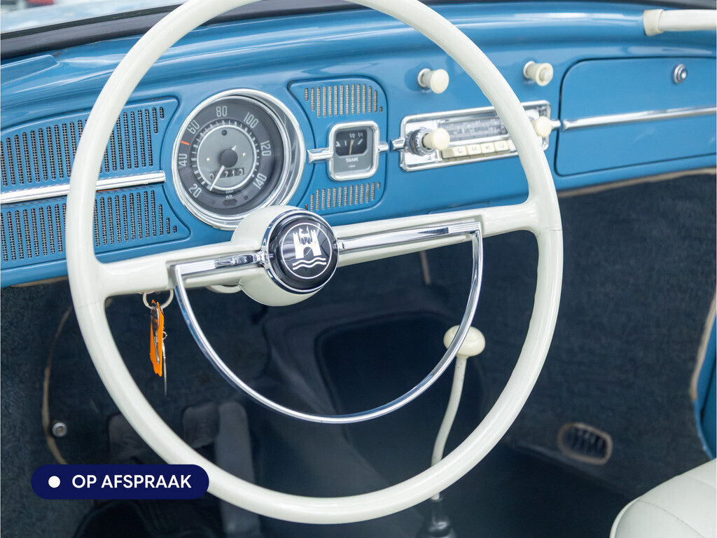 Te koop aangeboden: een schitterende Volkswagen Kever 1200 Cabriolet Karmann uit 1961, uitgevoerd in de originele kleur Gulf Blue. Deze klassieker verkeert in uitzonderlijke staat en is onlangs professioneel getaxeerd met een waardering van 2+ (zeer goede staat). Dat zegt alles over de afwerking, originaliteit en zorg waarmee deze auto is onderhouden.